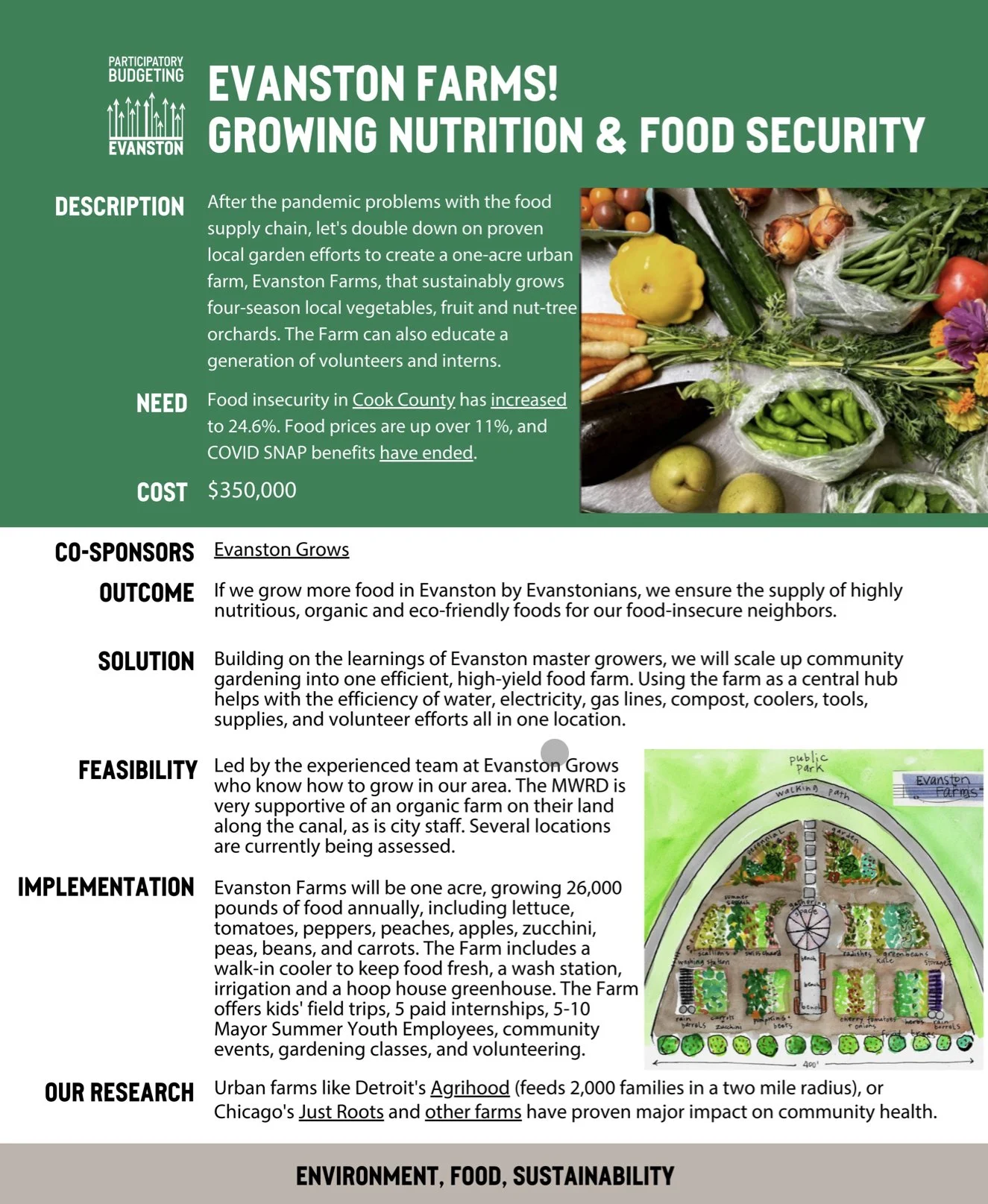 Help build the EVANSTON URBAN FARM, which will provide fresh organic produce to Evanston residents experiencing food insecurity. From September 1-30 you can vote for up to 7 projects (out of 20) to receive funding from Evanston’s Participatory Budgeting / federal ARPA funding. Evanston Grows and its partners need your vote for a $350K grant to create the EVANSTON URBAN FARM!